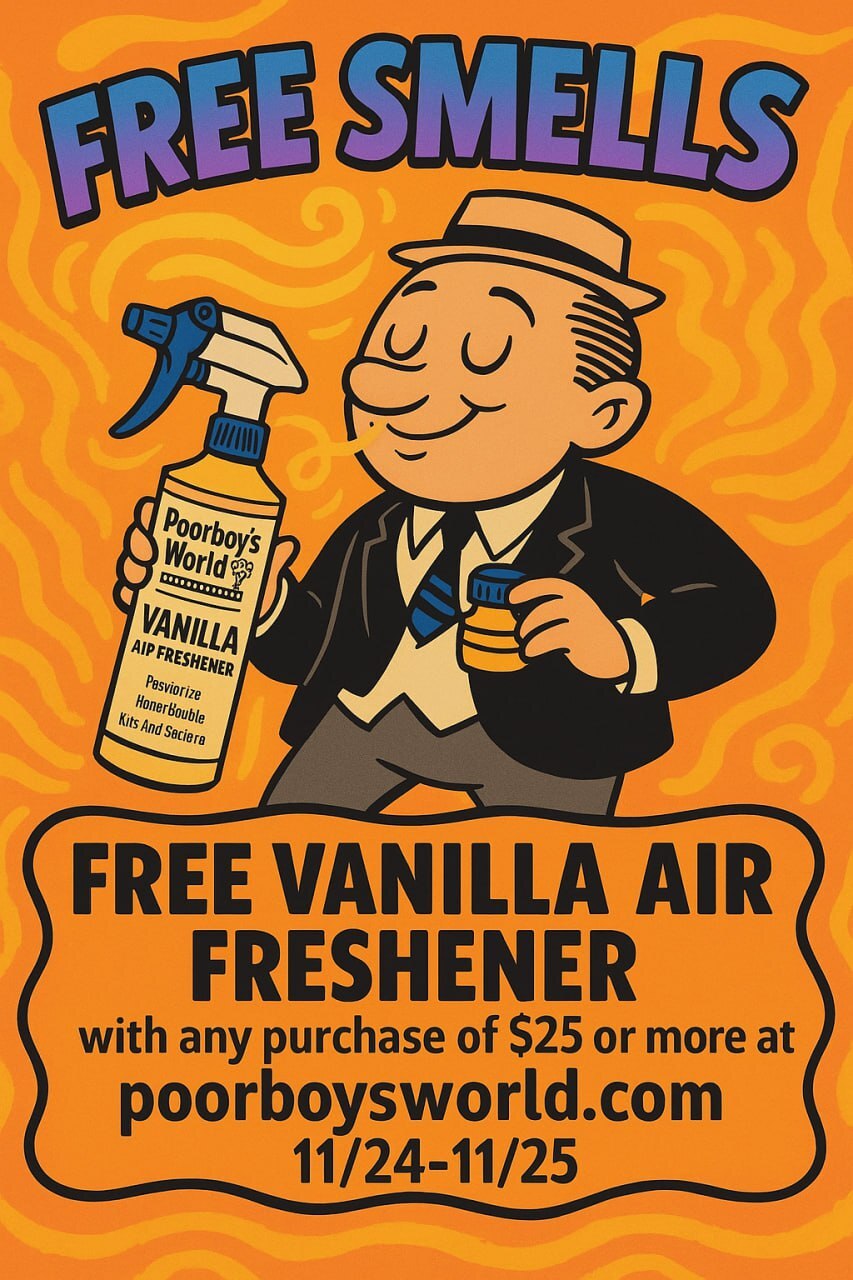 FREE VANILLA AIR FRESHENER WITH PURCHASE OF $25 or more today 11/24 and tomorrow 11/25. No code needed. 16oz Vanilla Air Freshener is automatically added to cart on qualifying orders.